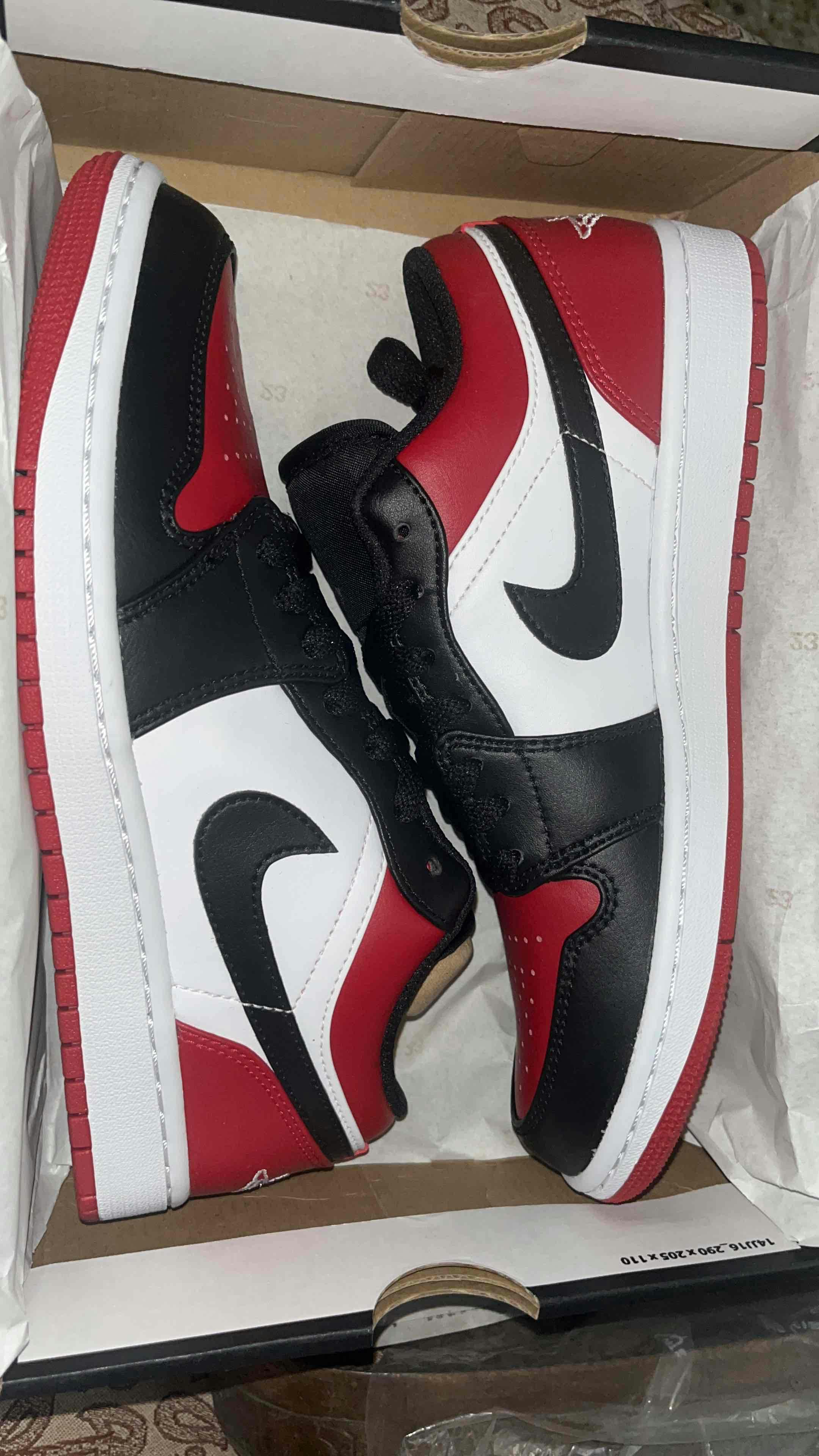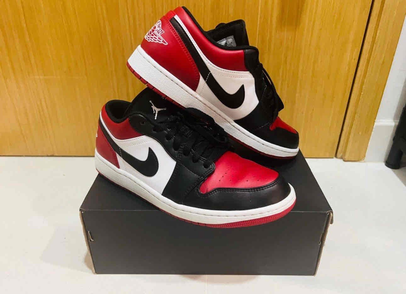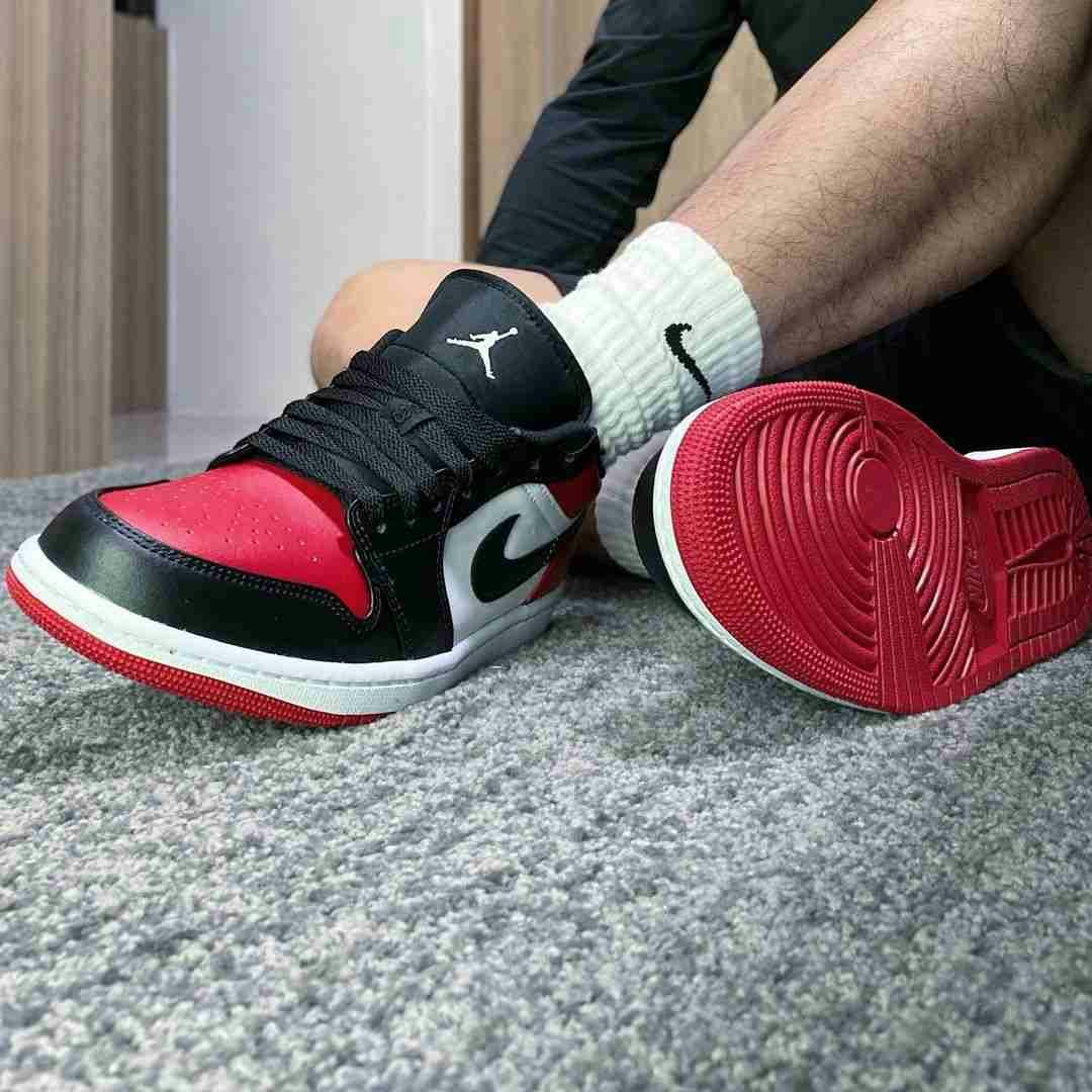 Kasut sukan ikonik Air Jordan 1 Low 'Bred Toe' dengan gabungan warna hitam, merah, dan putih yang mencuri tumpuan, direka untuk gaya kasual dan prestasi tinggi dengan sol getah tahan lama dan bahan kulit premium untuk keselesaan sepanjang hari.