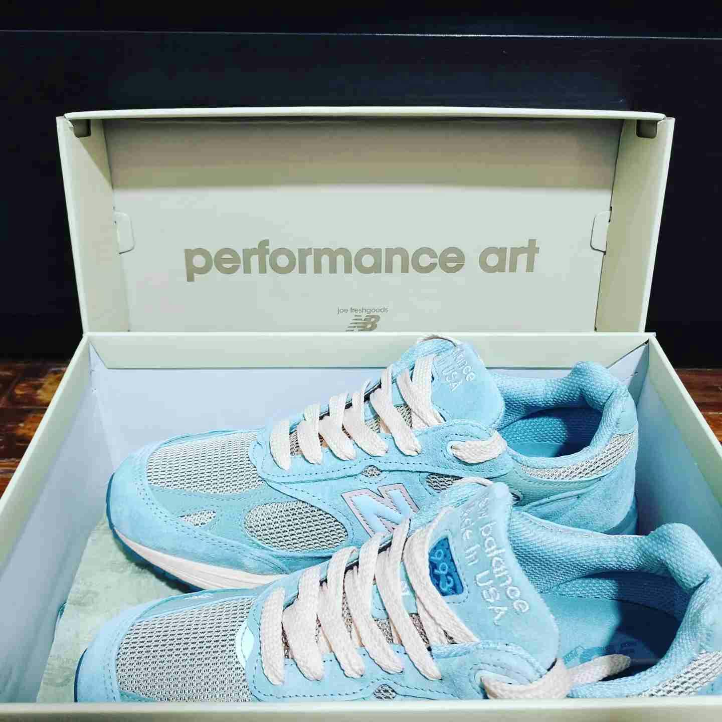 Introducing the Joe Freshgoods x New Balance 993 Made in USA Performance Art Sneaker in Arctic Blue. This limited edition collaboration combines style and performance. Crafted by New Balance, these sneakers are made in the USA and feature Arctic Blue details, making them a unique addition to your shoe collection. Perfect for the fashion-forward individual who appreciates high-quality craftsmanship.