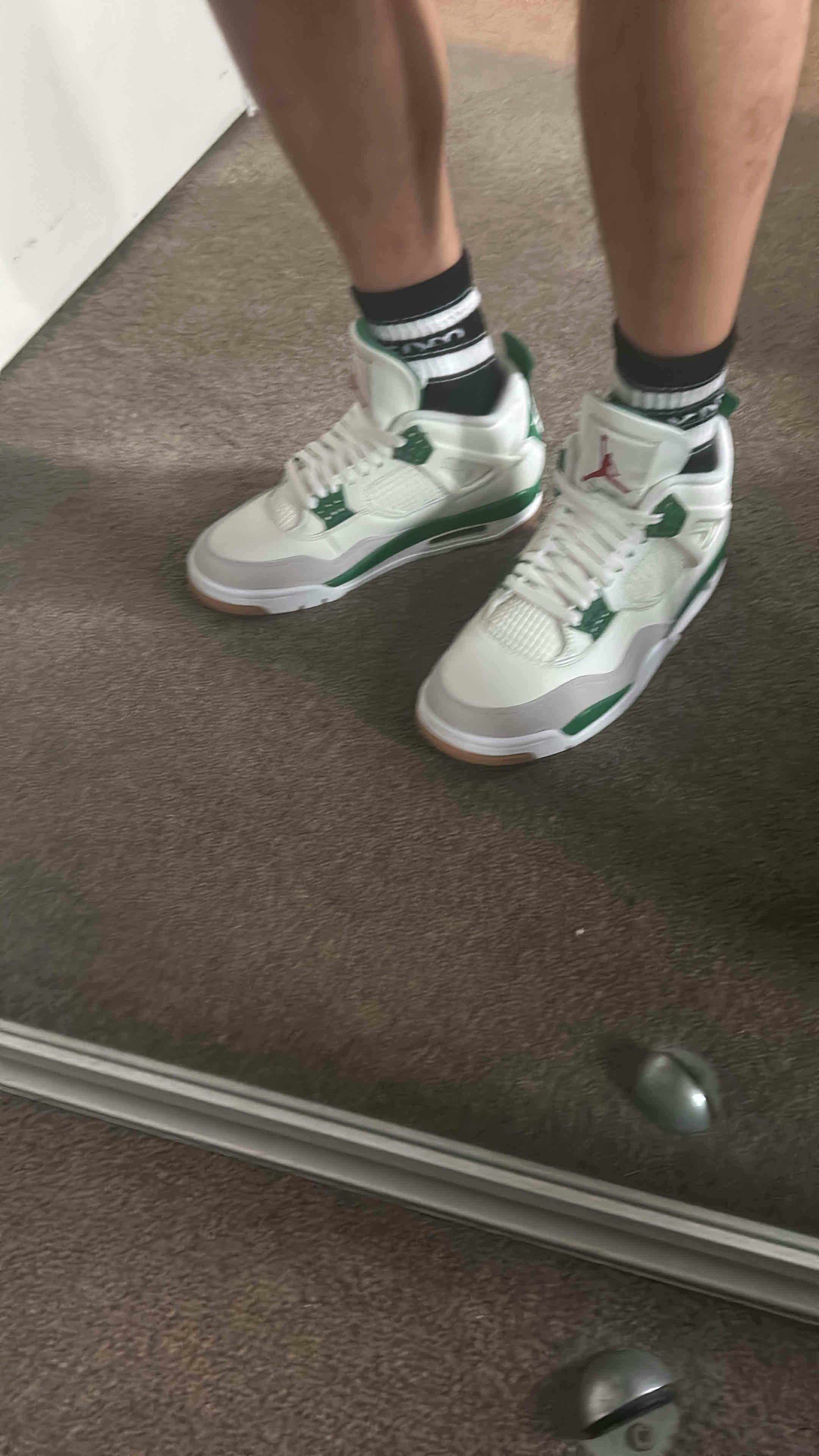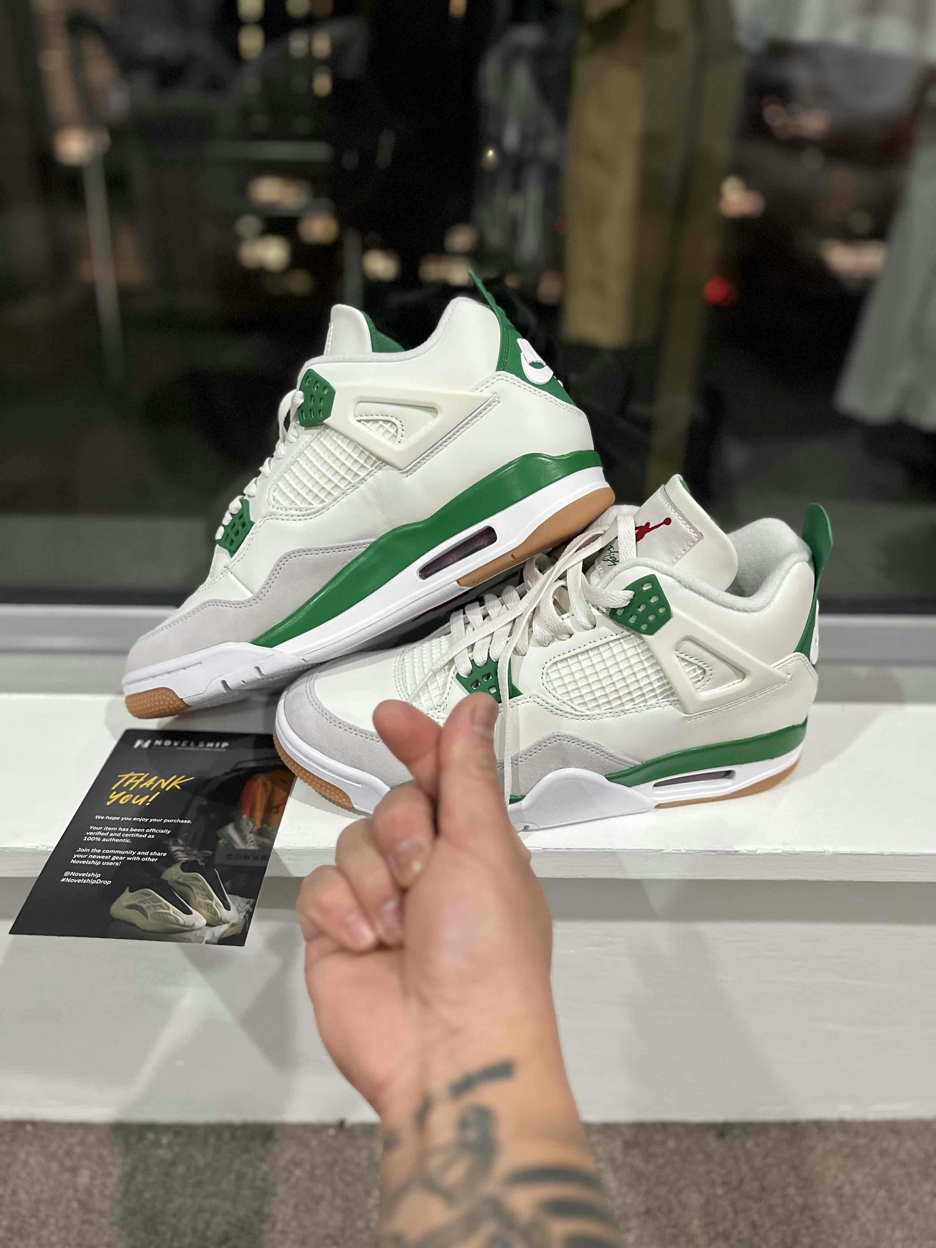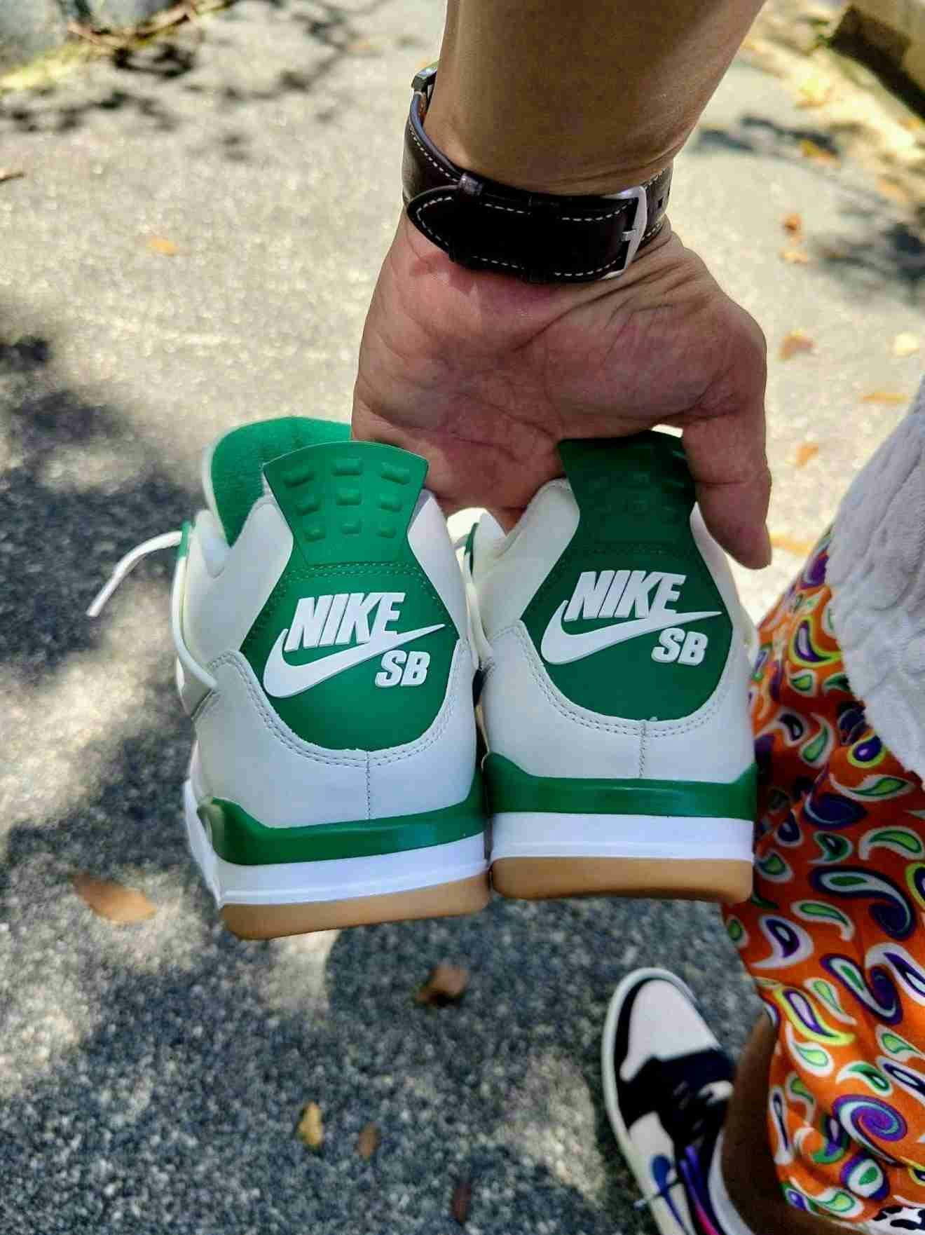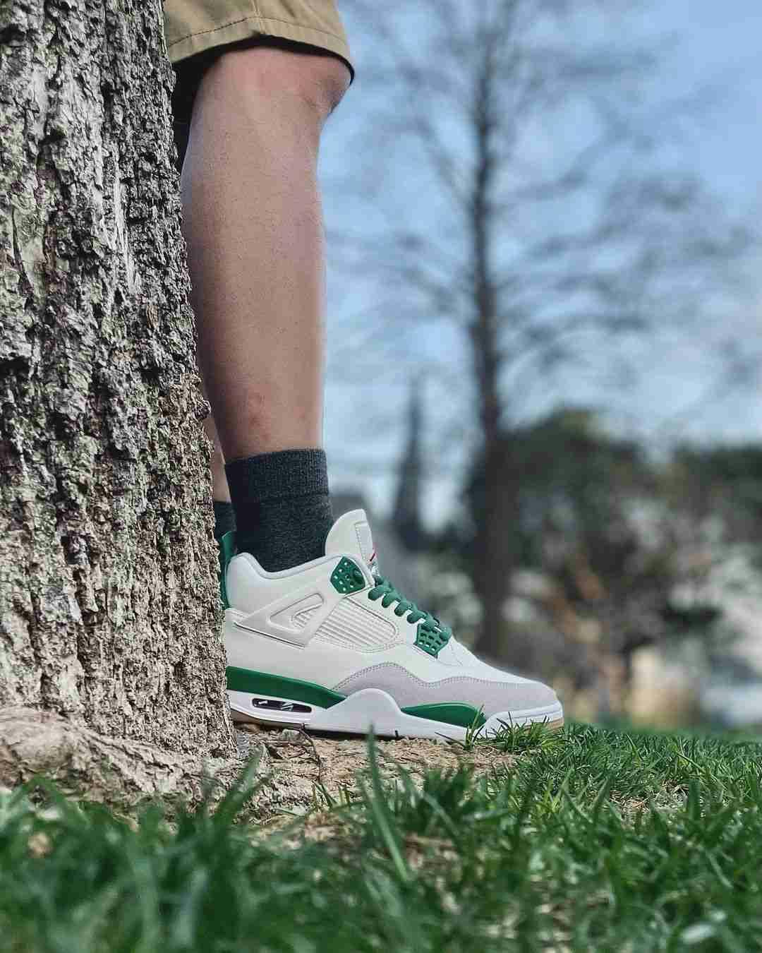 Introducing the Nike SB x Air Jordan 4 Pine Green. A collaboration between Nike SB and Jordan, these sneakers combine style and performance. The Pine Green colorway adds flair to the iconic Air Jordan 4 silhouette. Step out in style and show off your love for both brands with these eye-catching kicks.