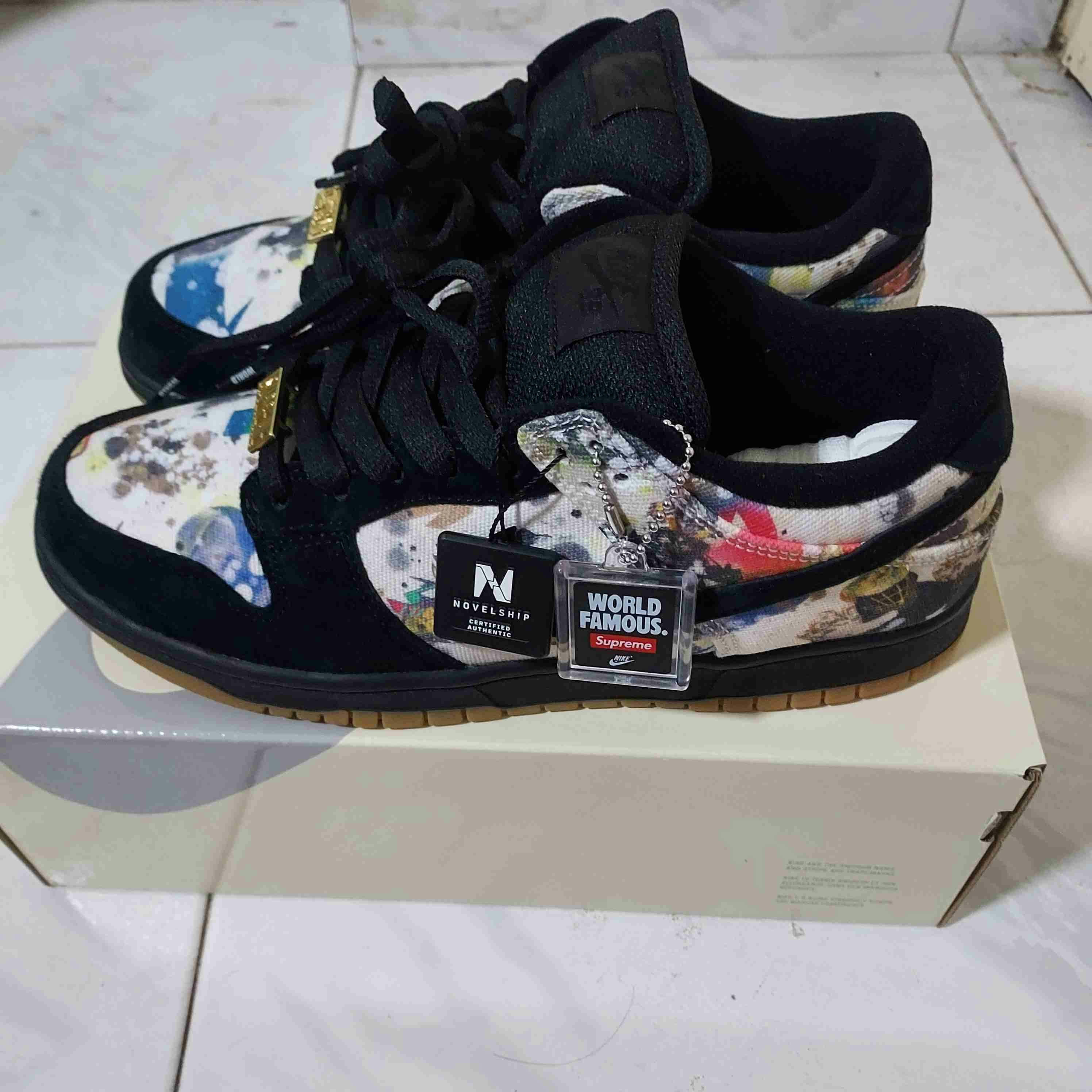 Elevate your sneaker game with the Supreme x Nike SB Dunk Low 'Rammellzee' sneakers, a limited-edition collaboration that fuses graffiti and hip-hop culture. Expertly crafted with premium leather, these sneakers boast intricate graffiti designs inspired by the legendary artist Rammellzee. The 'Rammellzee' logo emblazoned on the tongue adds a touch of exclusivity, while the Zoom Air cushioning ensures unparalleled comfort. Don't miss the chance to own these coveted sneakers and make a bold statement with every step.